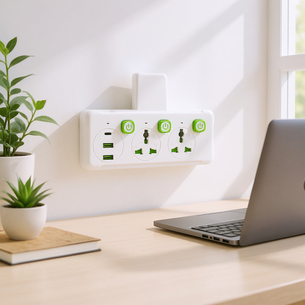 This is a wall-mounted power socket extender that combines AC outlets and USB charging ports into a single unit. It is designed for convenience, safety, and efficiency in homes, offices, or travel scenarios.
