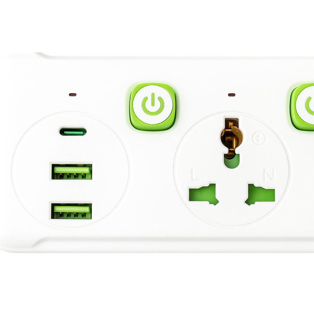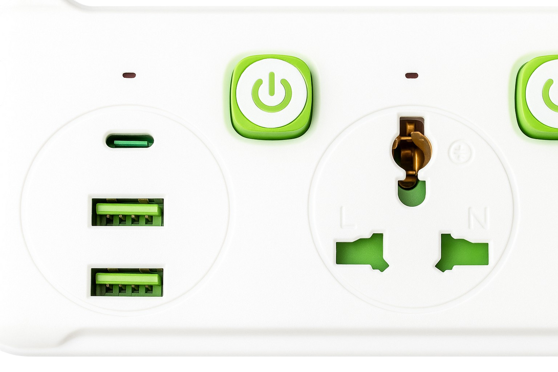 - Child-safety shutter design inside the outlets (common in multi-plug devices).