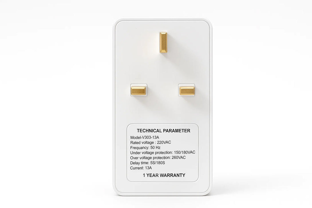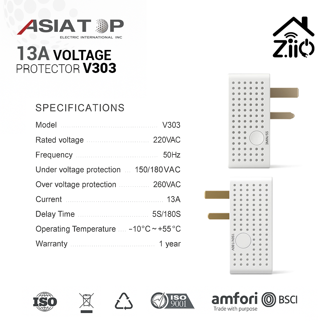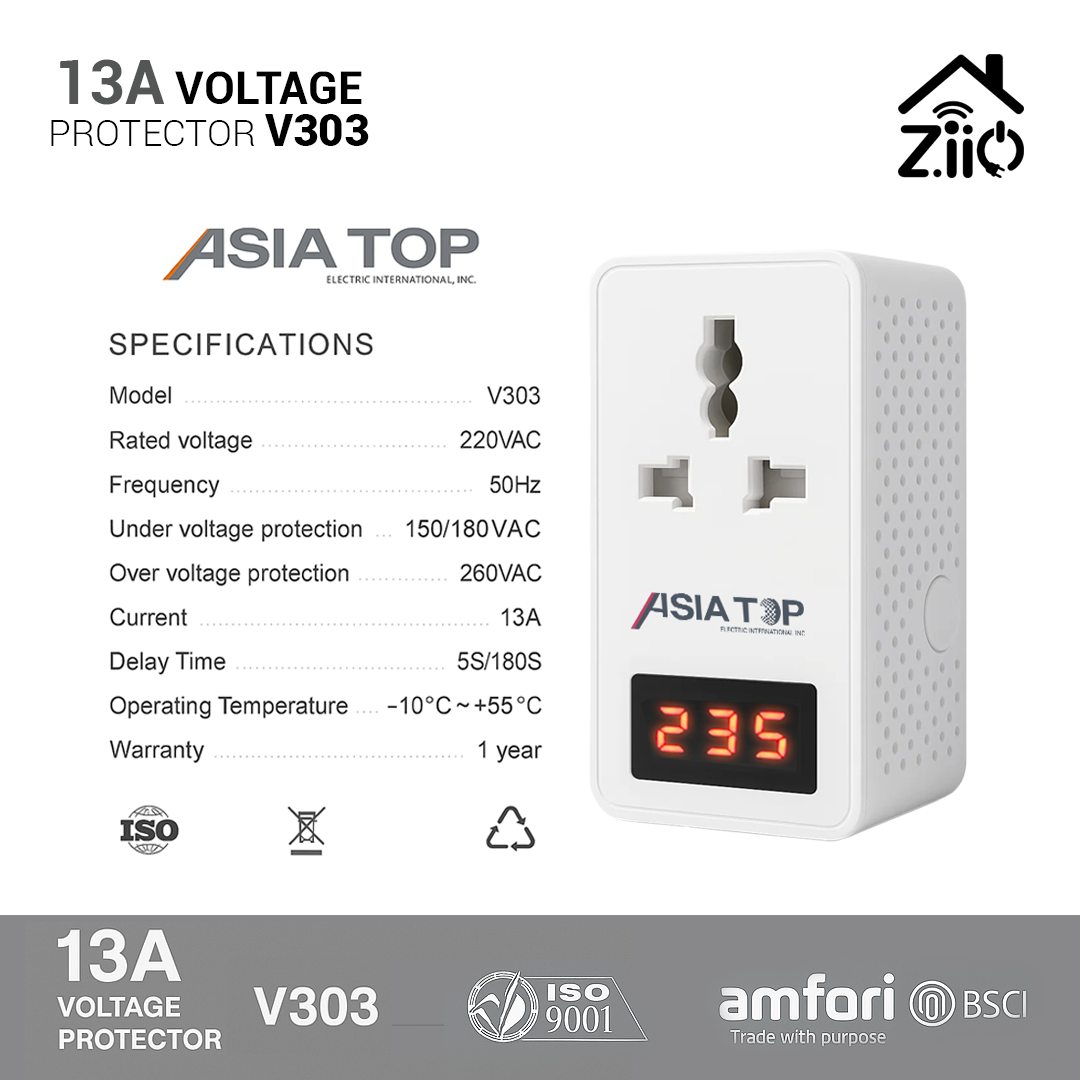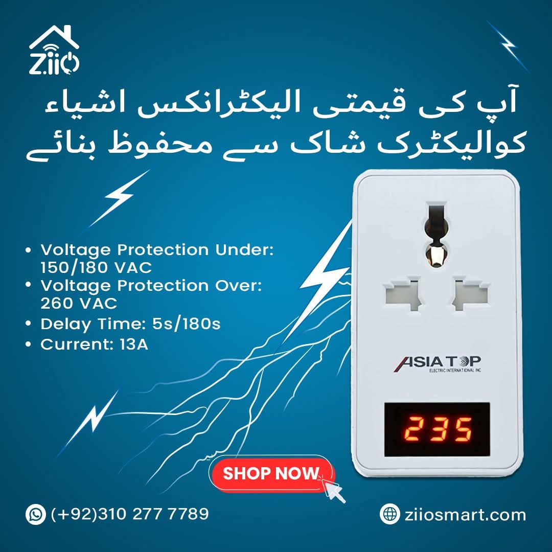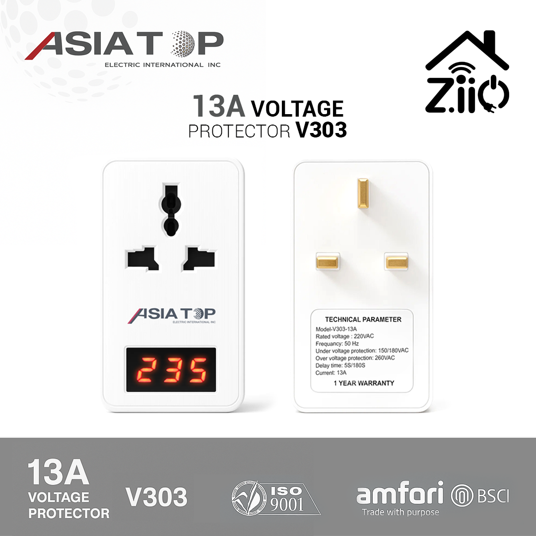 The Asia Top V303 Voltage Protector is a reliable and essential safety device designed to protect household and office appliances from voltage fluctuations. It features a universal socket, a UK 3-pin plug, and a real-time digital voltage display, making it both functional and user-friendly.