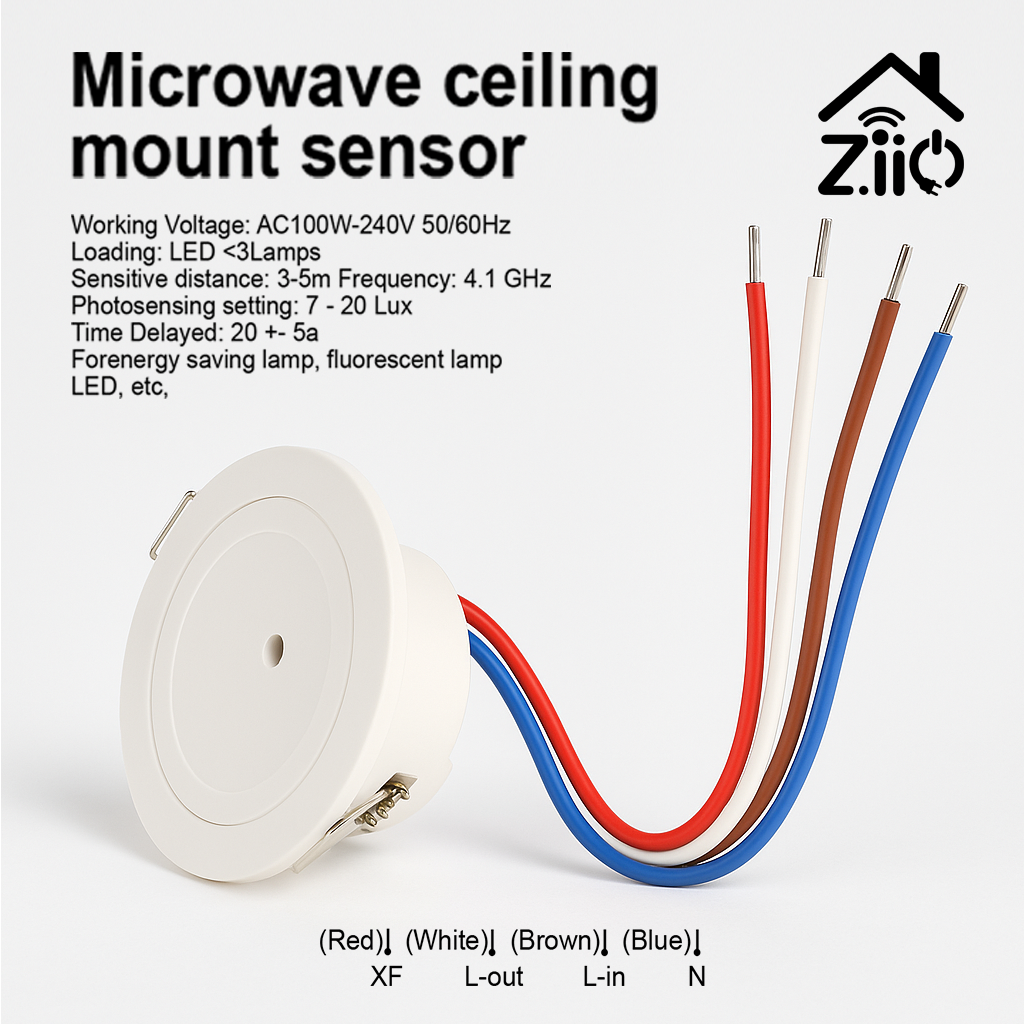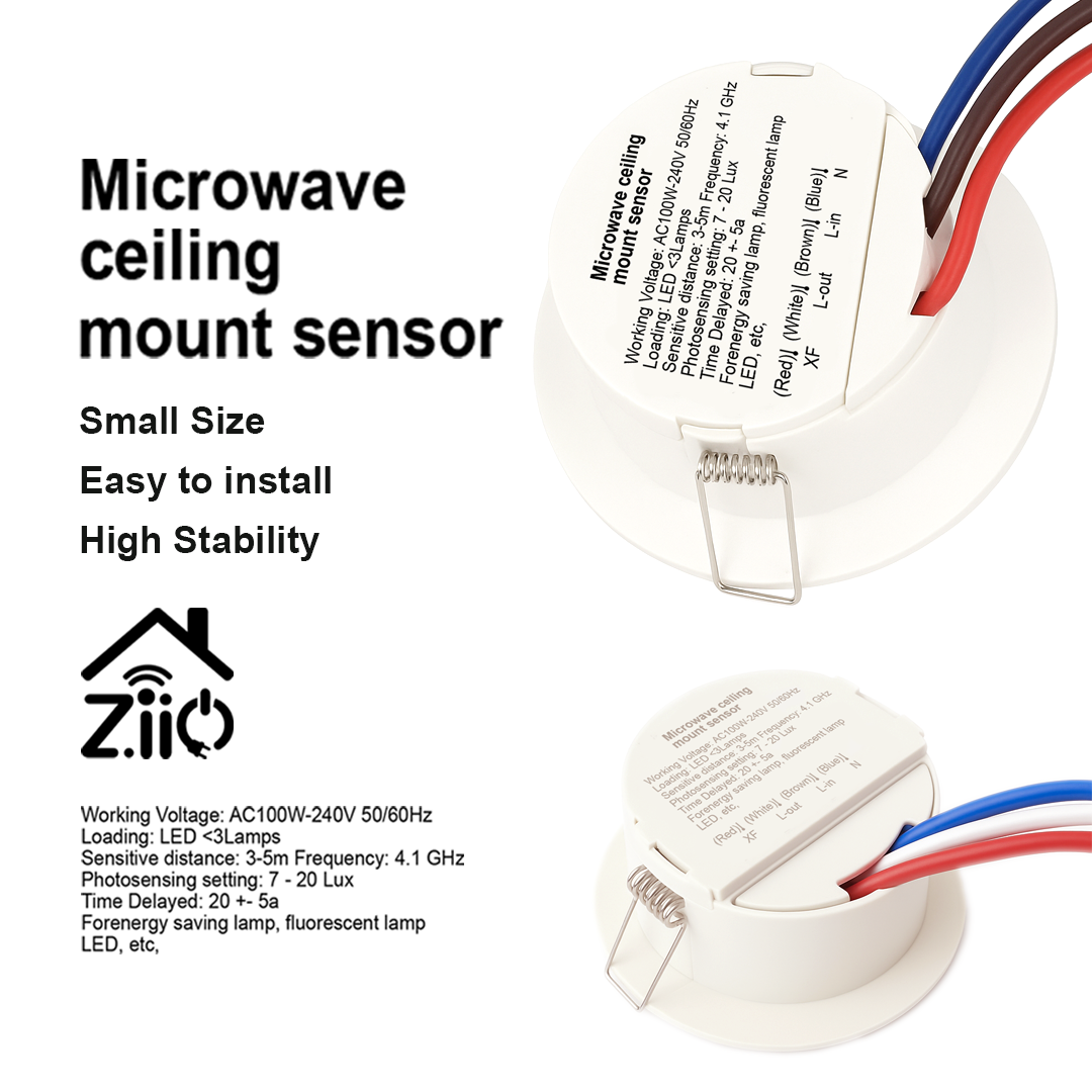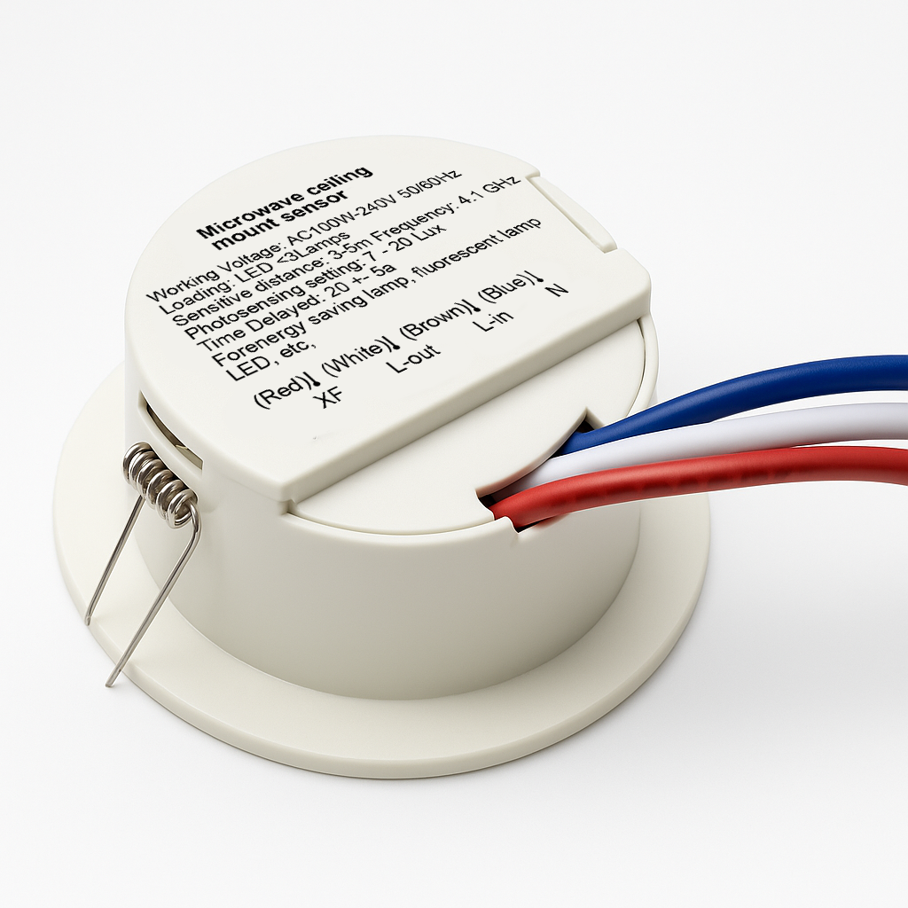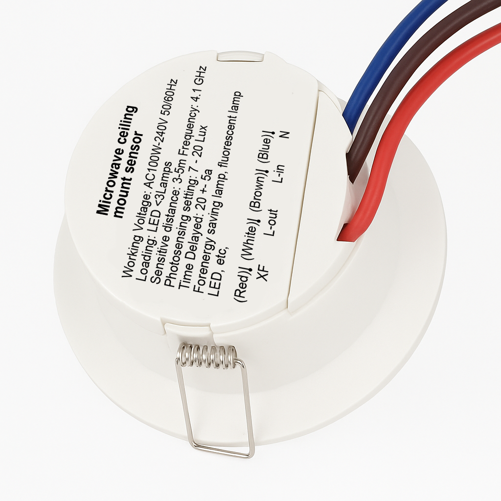 The Microwave Ceiling Mount Sensor is a compact, intelligent motion sensor designed to provide automatic lighting control in indoor environments. It uses microwave radar technology (operating at 4.1 GHz) to detect motion through doors, glass, or thin walls, making it more sensitive and accurate than traditional infrared (PIR) sensors.