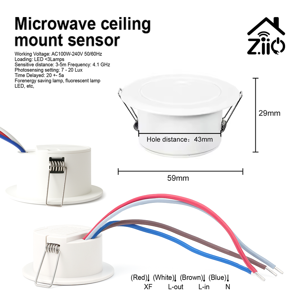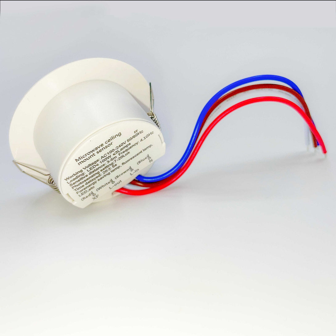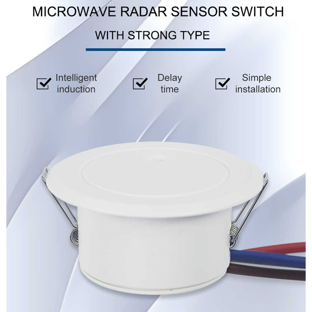 The Microwave Ceiling Mount Sensor is a compact, intelligent motion sensor designed to provide automatic lighting control in indoor environments. It uses microwave radar technology (operating at 4.1 GHz) to detect motion through doors, glass, or thin walls, making it more sensitive and accurate than traditional infrared (PIR) sensors.
