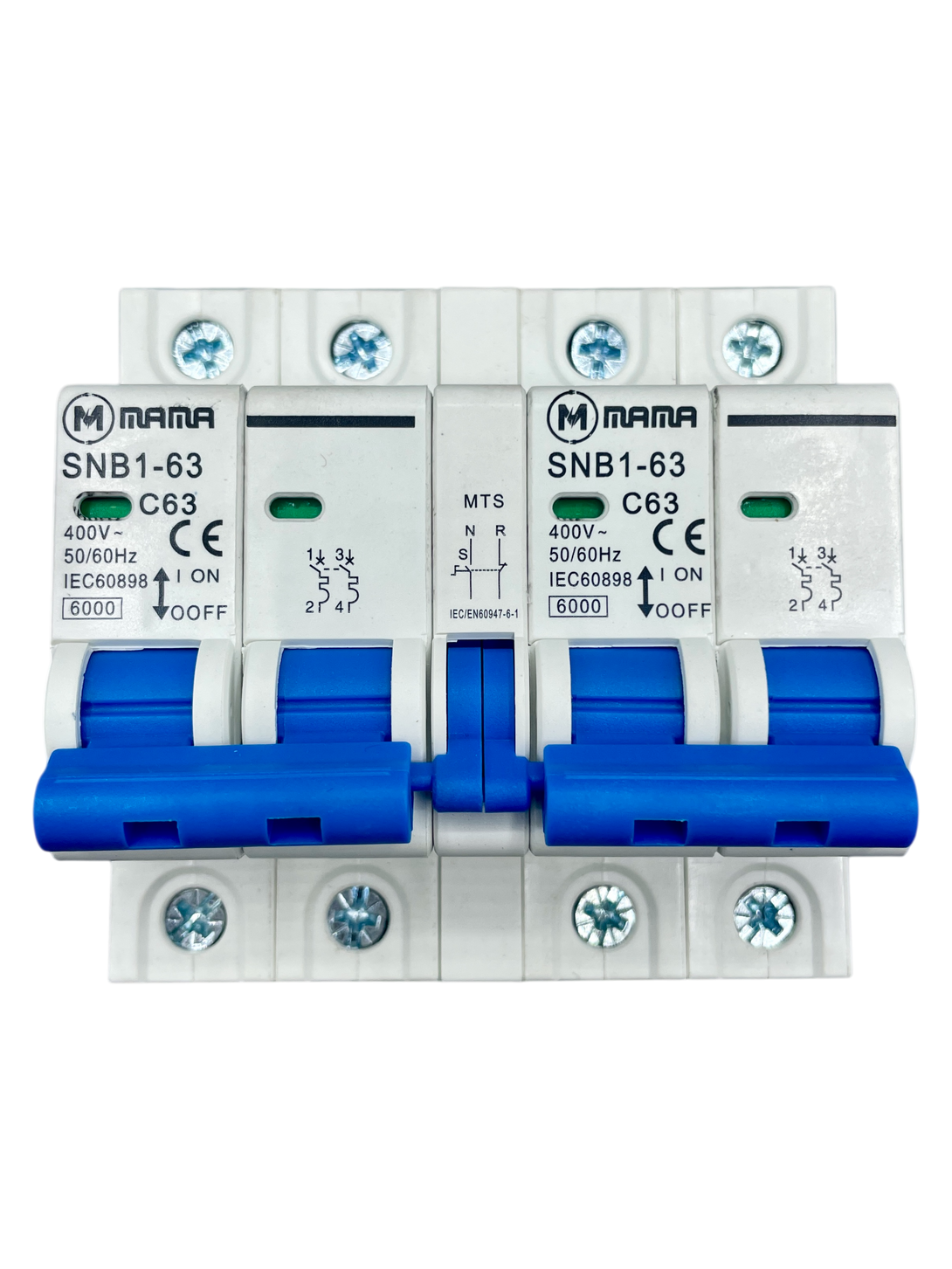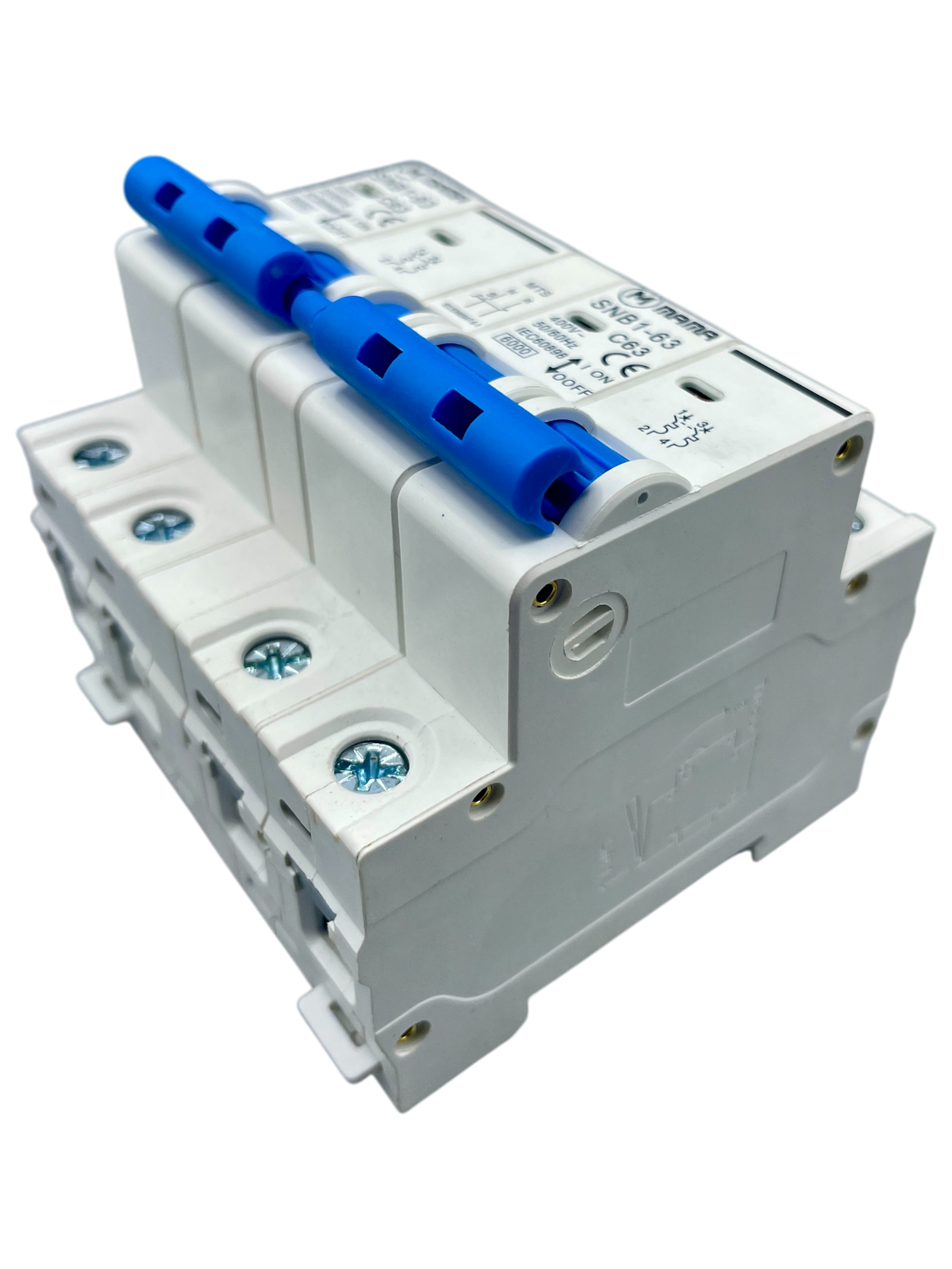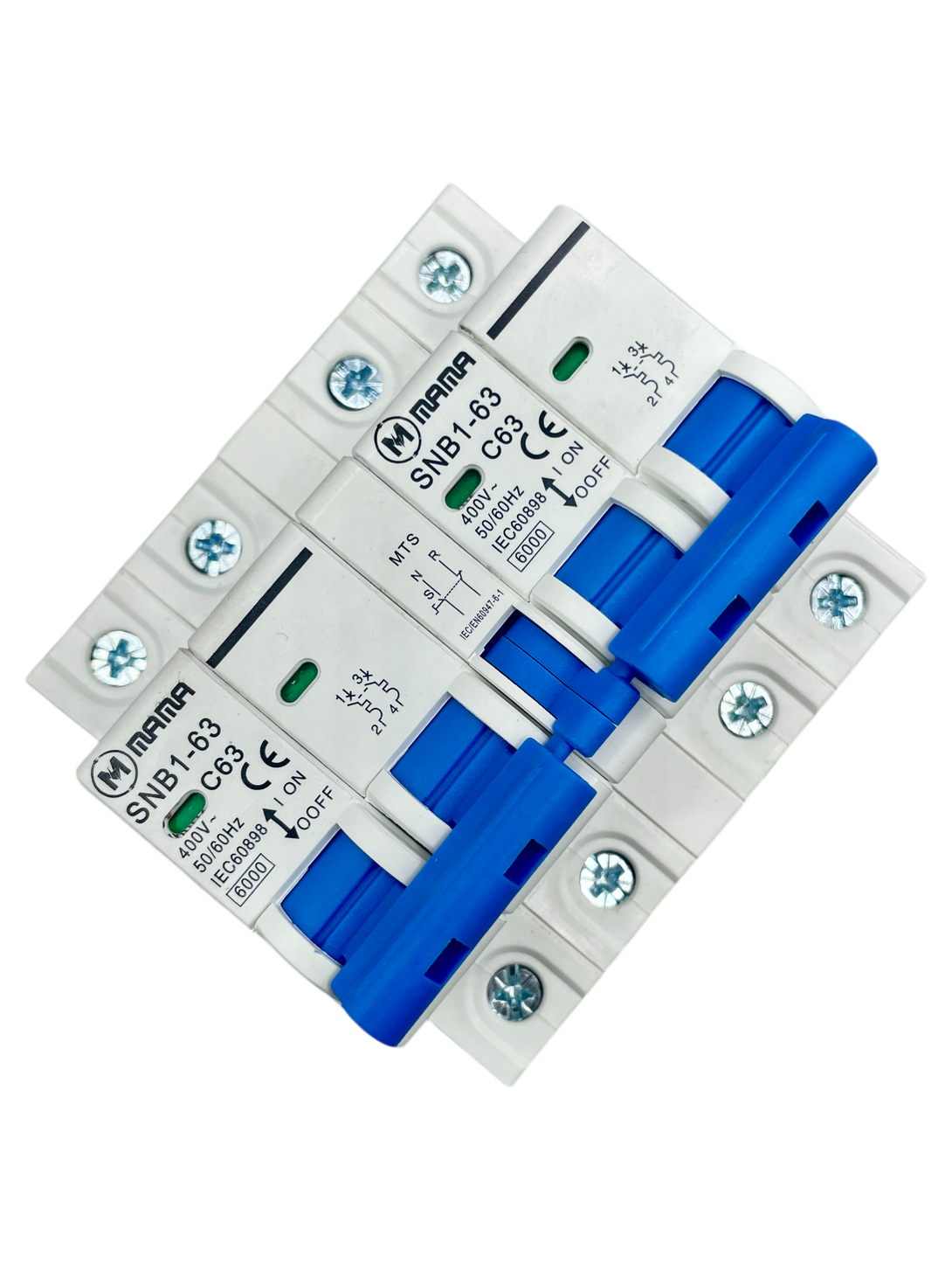 The MAMA SNB1-63 is a modular 3-pole miniature circuit breaker (MCB) designed for the protection of low-voltage electrical circuits against overload and short-circuit currents. It features an interlock system for improved safety and is compliant with international standards for residential, commercial, and industrial applications.