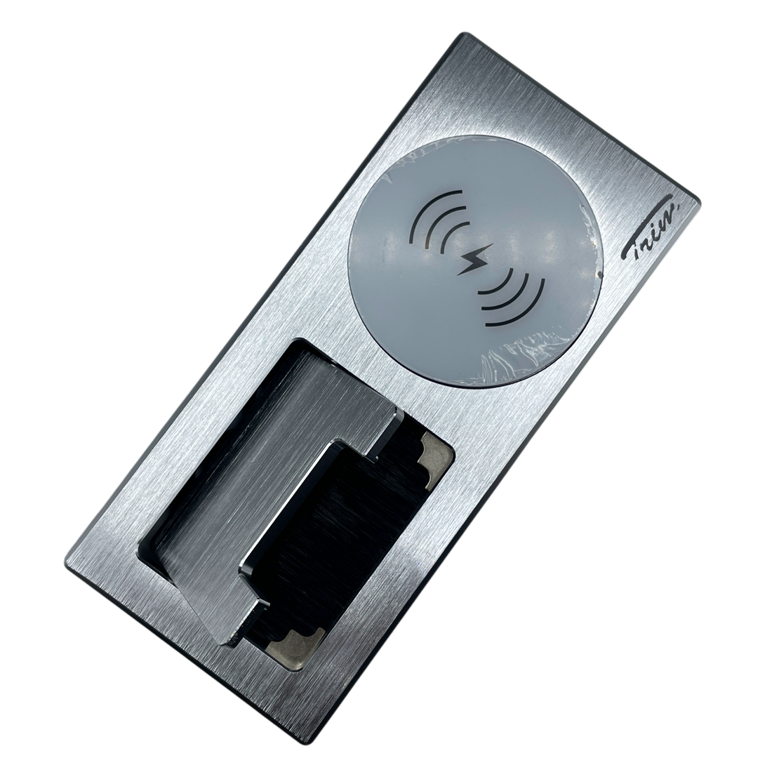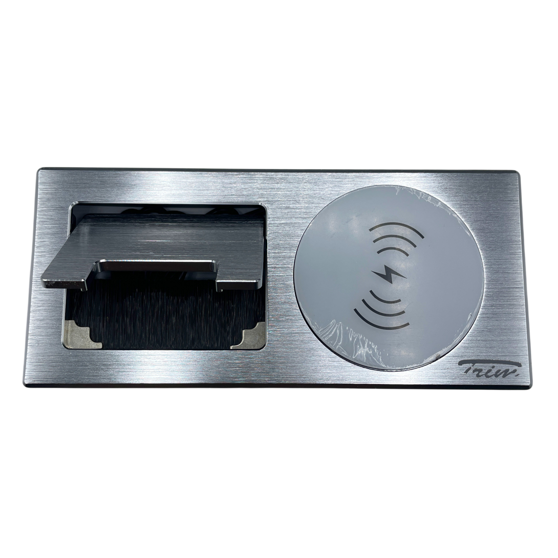 This is a Modern Tabletop Cable Management & Wireless Charging Box, designed to integrate power access, cable organization, and wireless charging into a single stylish unit. Ideal for conference rooms, workstations, offices, and hospitality environments, it offers convenience and functionality while maintaining a sleek, professional appearance.