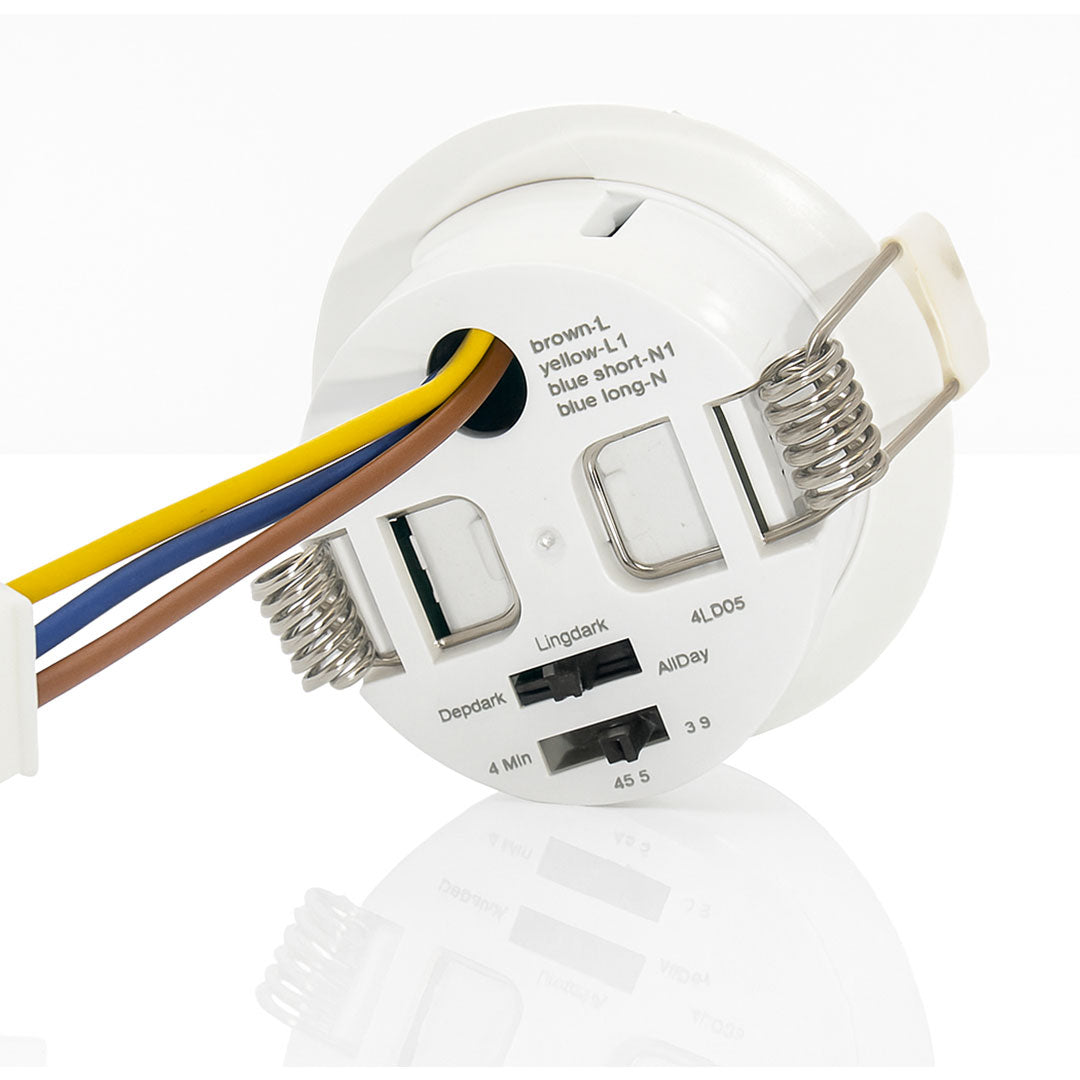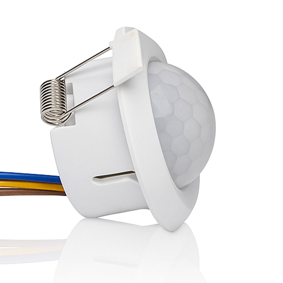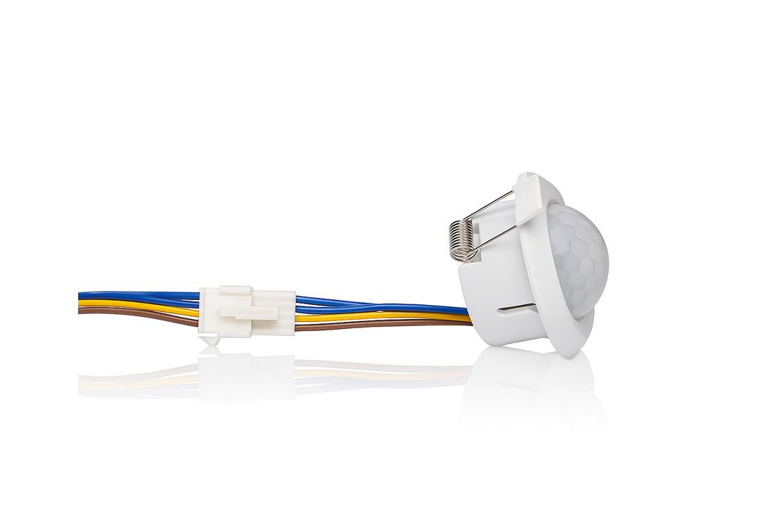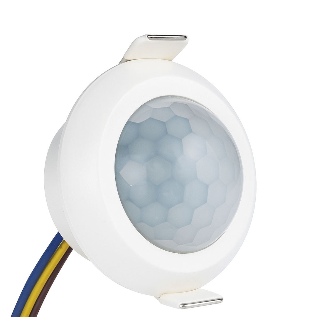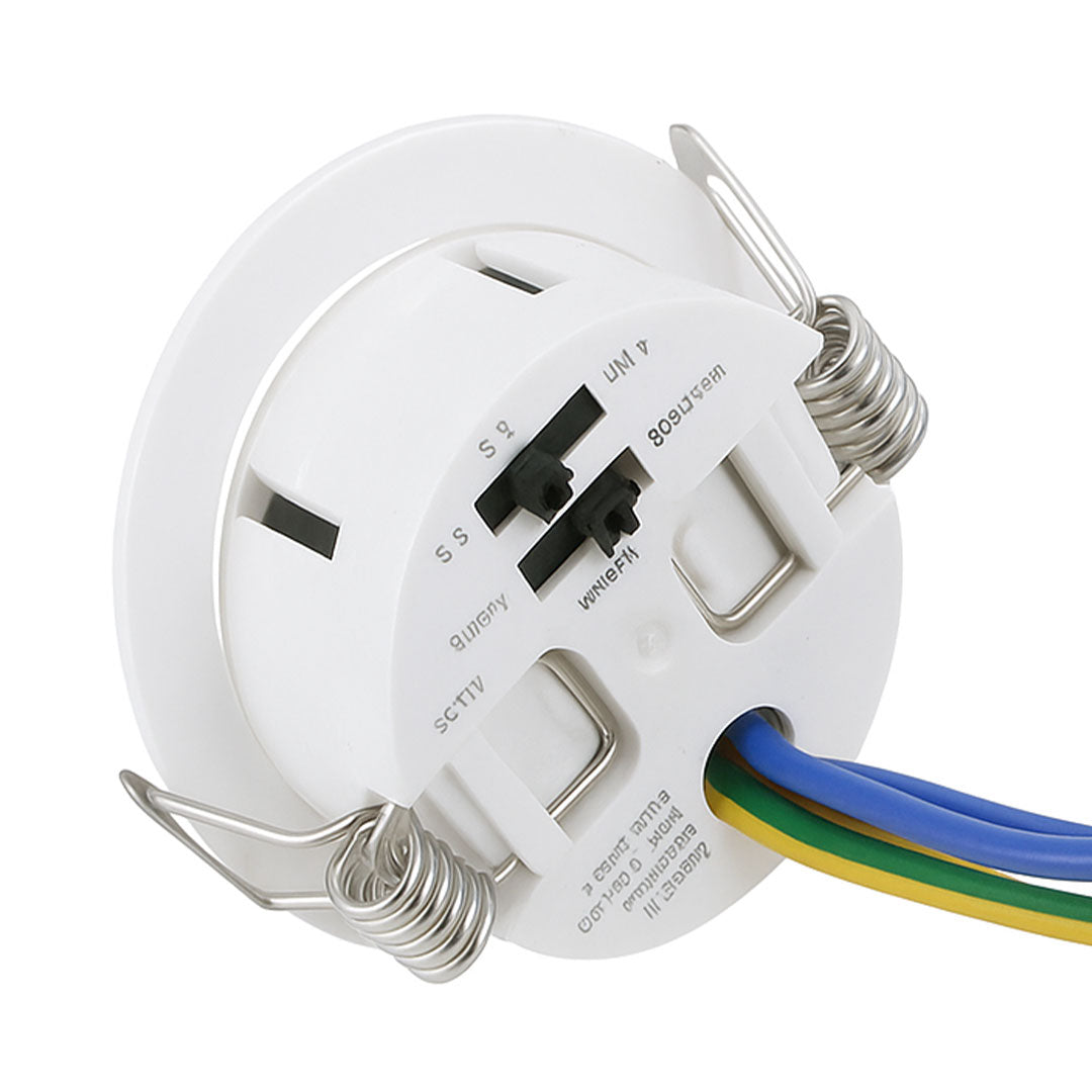 This ceiling-mount Passive Infrared (PIR) Motion Sensor is a compact and energy-efficient device designed to automatically control lighting or electrical loads based on motion detection. It features a highly sensitive Fresnel lens that enables 360-degree motion detection, making it ideal for indoor applications such as hallways, staircases, bathrooms, and offices.When movement is detected within its sensing range, the sensor activates connected lights or devices. After a preset delay time with no further motion, it automatically switches them off—helping save energy and extend the lifespan of lighting systems. The device is equipped with adjustable settings for both time delay and ambient light sensitivity (LUX), allowing you to customize its behavior based on the lighting conditions and usage preferences.Designed for flush-mount installation into ceilings, the sensor features sturdy spring clips for secure mounting and a sleek, low-profile design that blends seamlessly with modern interiors. It supports standard AC voltage and is compatible with various lighting types including LED, incandescent, and fluorescent.
