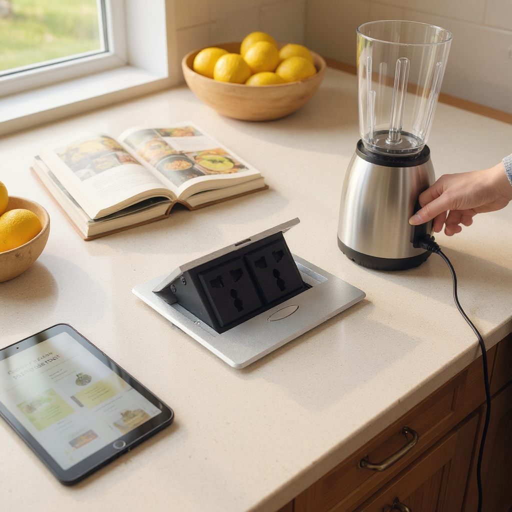 - Spring-loaded, push-to-open system: the outlet pops up smoothly when pressed.