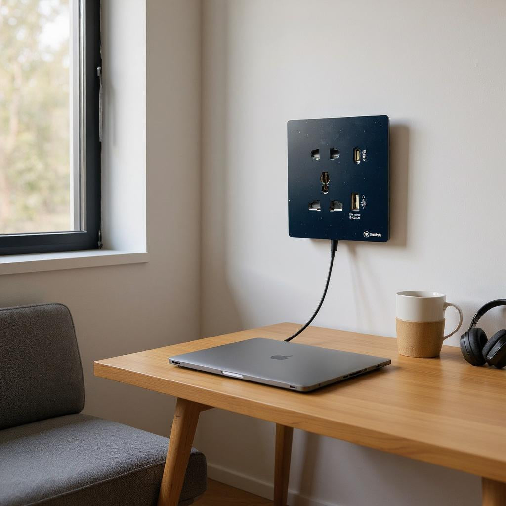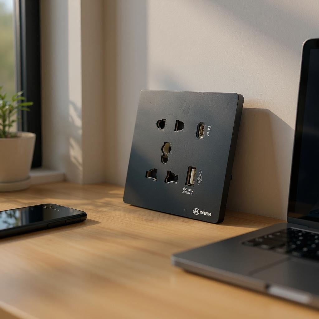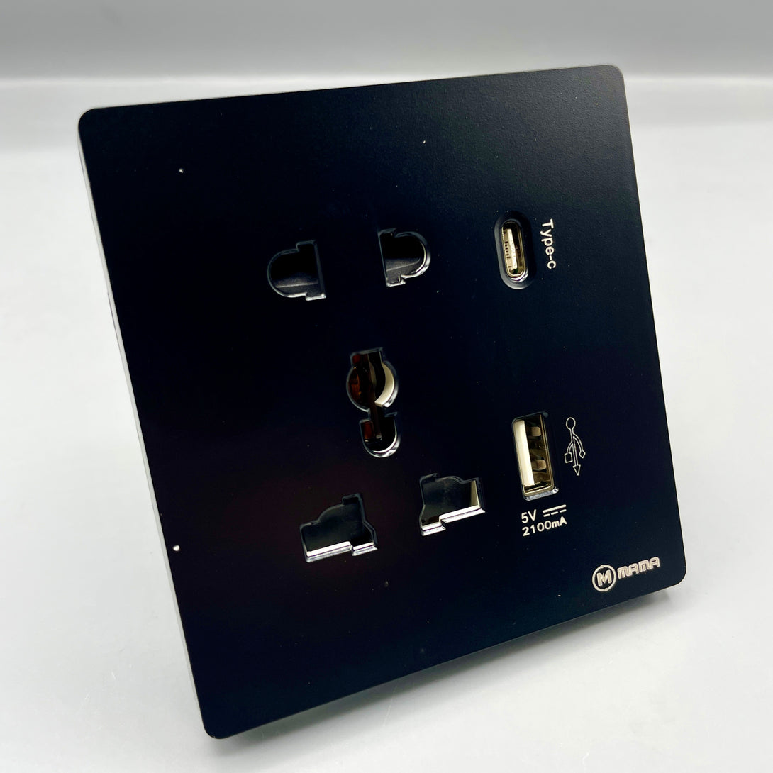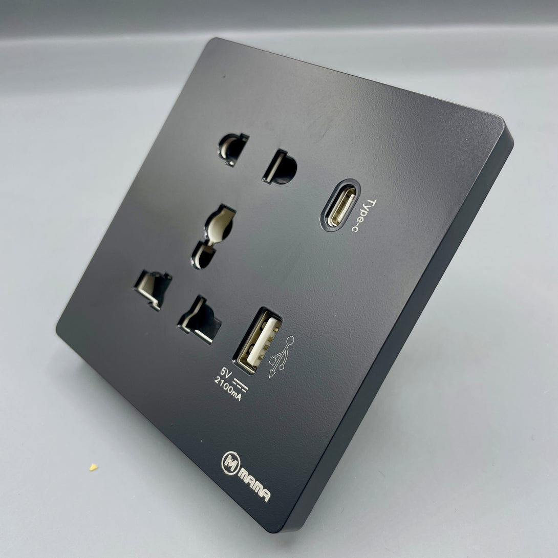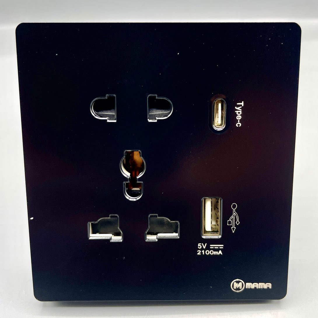 The MAMA Universal Wall Socket is a modern and efficient power outlet designed to support multiple plug types and fast device charging. Ideal for residential, commercial, or hospitality settings, it combines functionality with a sleek matte black finish to complement any interior.