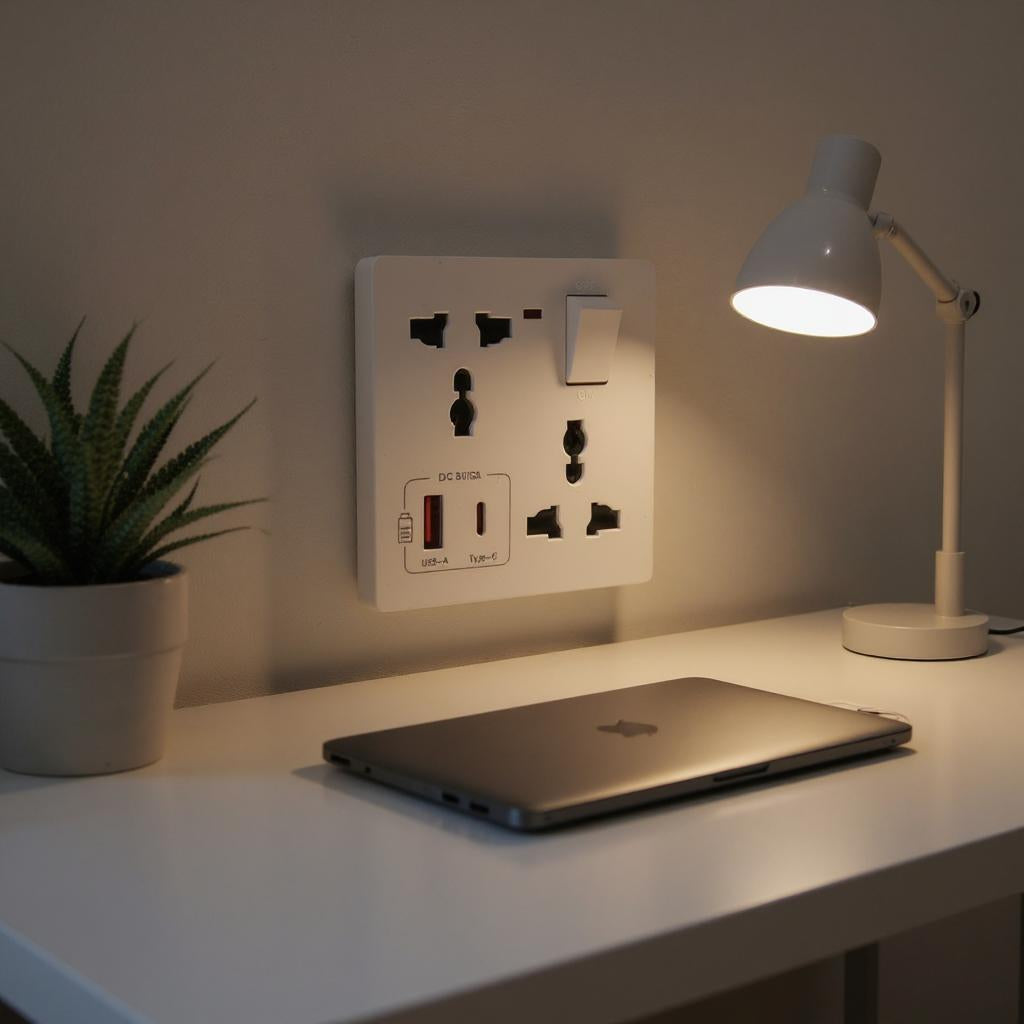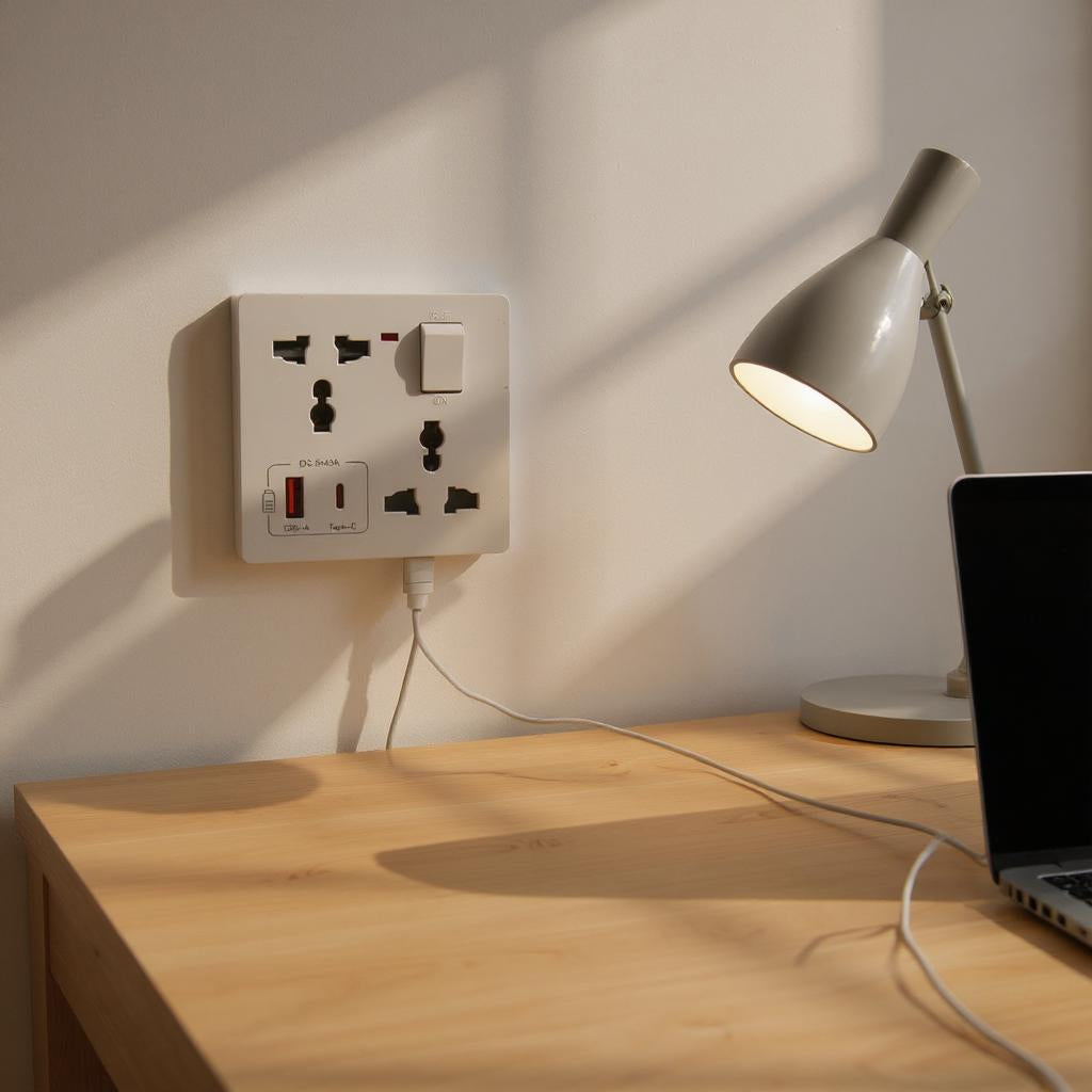 Power Switch Control Manual ON/OFF switch helps control power flow and enhance safety .Modern Clean Design Minimalist white design fits seamlessly into any interior space. Safety Features Built-in child safety shutter, fire-retardant materials, and surge protection.