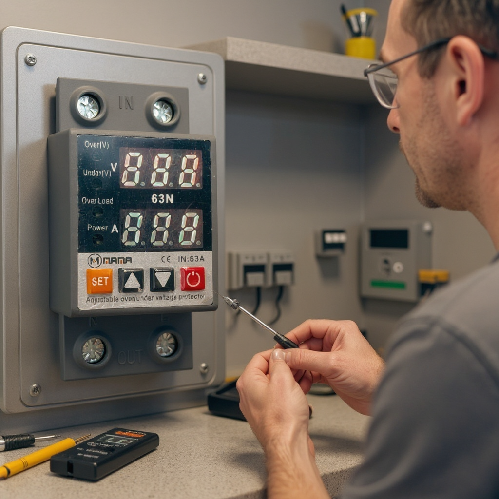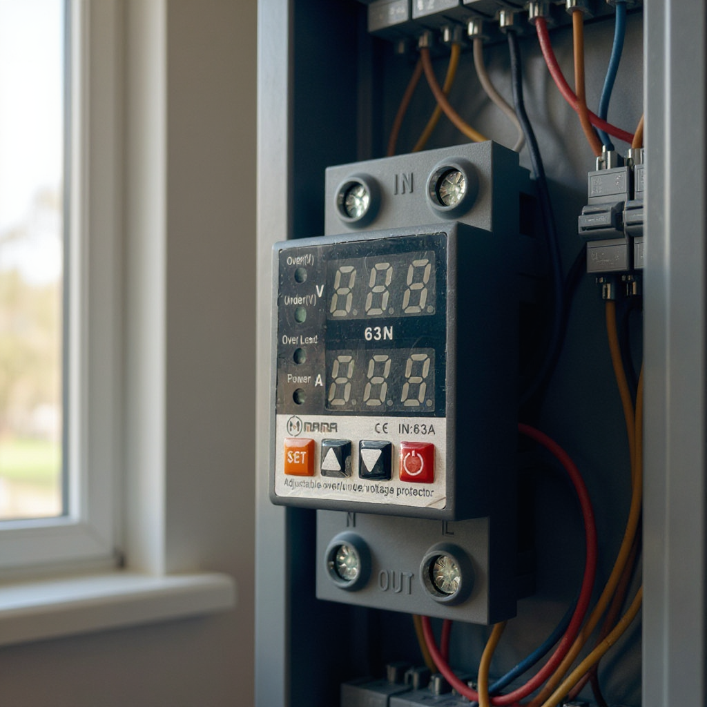 - Purpose: The device is designed to protect electrical appliances from voltage and current (ampere) fluctuations. It helps in preventing damage due to over-voltage, under-voltage, and over-current conditions.
